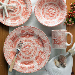 "Peter Dunham's toile de Jouy, custom-printed for me on a cream linen. Horrifically expensive, but well worth it. And [my partner] David's birthday present to me - Coral Torquay earthenware dinner plates by Mottahedeh."
