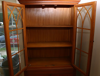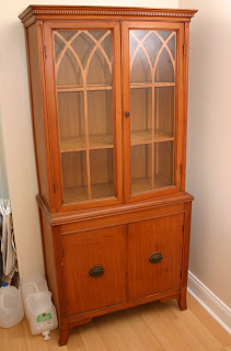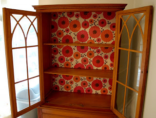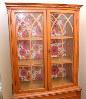 In moving my husband and I acquired an old china hutch from my mother. She tells me it's ancient, maybe even antique. It's cute and small and bursting with subtle personality, but I wanted to update it a bit. I thought about re-painting it, but I'm always weary about painting old furniture. So instead I decided to give it a bit more pizzaz by wrapping the back panel. We have this little guy sitting in the corner of our kitchen.