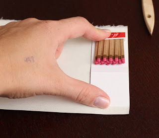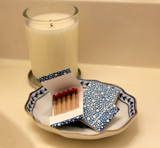 I like keeping candles in our bathrooms. It gives people the opportunity to light them instead of using an air-freshener. Often I don't really like the synthetic smell of air fresheners. The only issue with placing a candle in the bathroom is that you need to have something to light it with. You could leave a lighter in there, or fill a tray with matchbooks you've collected from restaurants. But what I'm starting to find is that a lot of restaurants are more inclined to put out mints instead of matches. So, I ran to the local grocery store to pickup a set of matchbooks. The only issue was that they were ugly. "Not a problem." I said as I dashed up the stairs to my paper-stash. This is an incredibly easy and cheap way to decorate your bathroom in a very practical way.