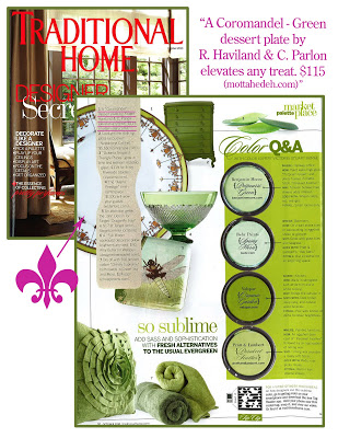 Traditional Home this month gives a glimpse into the vibrant world of LIME homegoods. Look for our R. Haviland & C. Parlon Coromandel - Green Dessert Plate (HP74029) - $115