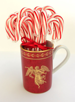 A hostess gift that is as sweet as the hostess you're visiting! A seasonal mug dressed up with a ribbon-tied handful of candy canes and hershey kisses. Now let's go find some mistle-toe and share some real kisses.