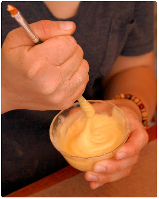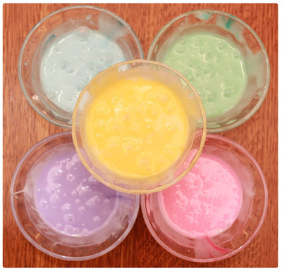 Separate the white frosting into smaller bowls and mix with as many different colors as you'd like to use. We thought 5 colors to choose from was enough.