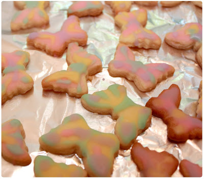 Alice is shrunk, but now what does she do? She eats the "eat me" cookies and grows! We made our own "eat me" cookies and butterflies out of sugar cookies, frosting, and edible dye.