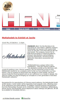 HFN is in on the scoop that we'll be showing, for the first time in our long history, at the Javits Center next month during the NY Gift Fair! If you're there, come and find us! We're booth #2804 and we have some exciting decorations in the works. Can anyone say, "Blue Canton Inspired?" We can! Look for the blue and come say hello. We'd be happy to see you.