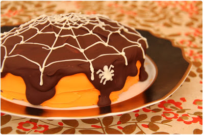 But instead of pouring the ganache over the top, we decided to make a cream cheese frosting flavored with almond and tinted orange for the occasion. The rest of the ganache was poured over the top of the cream cheese frosting and we piped melted white chocolate onto the cake for the web and spiders.