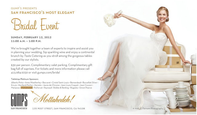 Here's an event you don't want to miss! GUMP'S is having a Bridal Event on Saturday, February 12 from 11am - 1pm and Mottahedeh is a Tabletop Platinum Sponsor. So grab your best girl friend and buy tickets for the event.