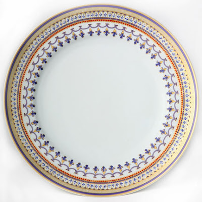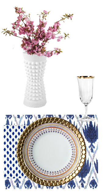 The youthful edge came care of a textured Jonathan Adler vase and the mixed ikat patterned placemat and napkin. I ushered in tradition with the Vera Wang gold-rimmed goblet and L'Objet Aegean charger. Of course, we couldn't abandon that Chinoise inspiration so cut cherry blossoms filled the vase to lend an Oriental appeal while also singing spring.