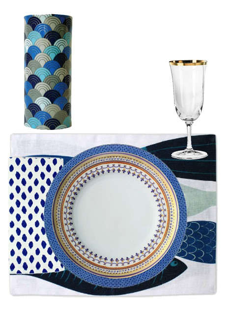 My friend's sister-in-law had mixed in Mottahedeh's Blue Lace with Chinoise Blue so I took her cue and ran with it. The goblets and napkin remained but Jonathan Adler's pesce-placemat and scaly vase added a nod to the summery sea.