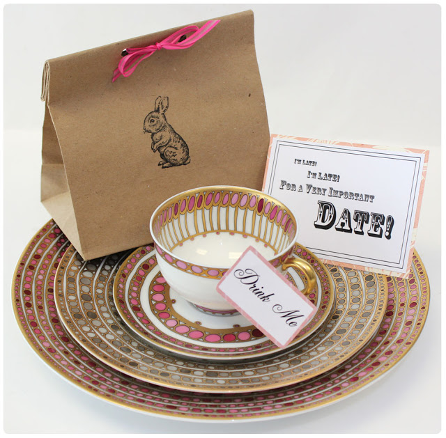 A mad hatter inspired bridal shower tea party. The playful design of Syracuse and Tobacco Leaf play up the theme beautifully. Of course the White Rabbit had to make an appearance.