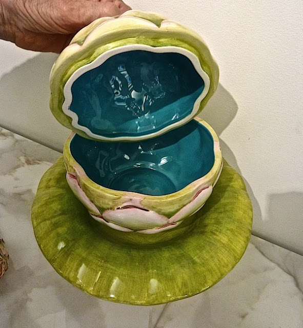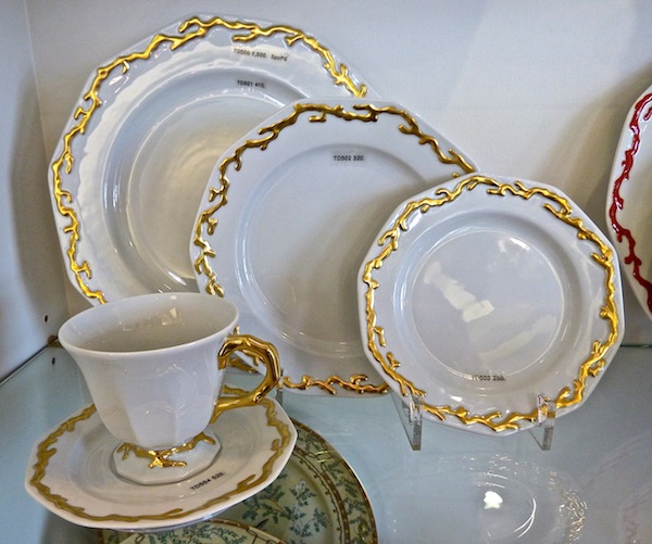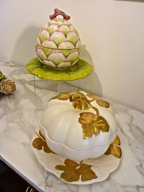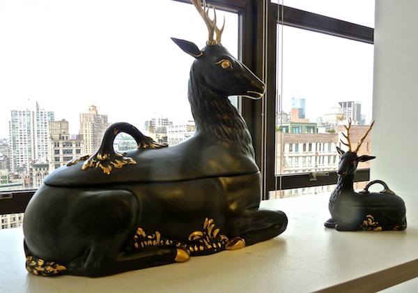 "Tony Duquette also introduced a grouping of basalt look alike pieces. Actually a matte black glaze to emulate the much heavier stoneware, my favorites were these striking Noble Stags. Available as a large tureen and smaller compete, they are adorned with 22k gold accents and would be fabulous accents to either traditional or modern dining environs."