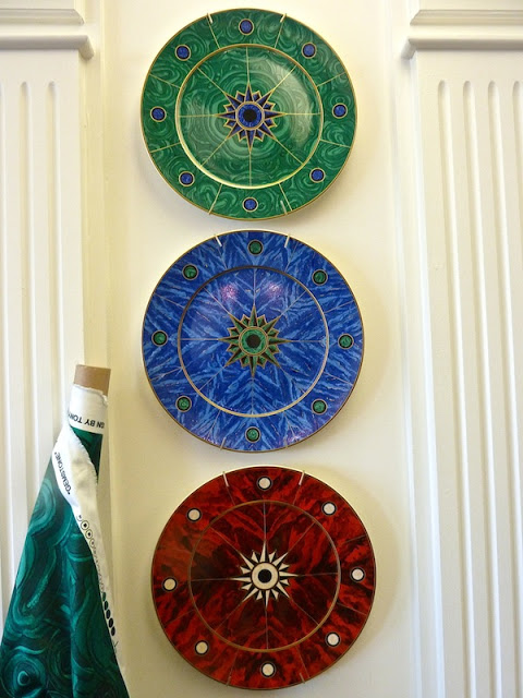 "A new collaboration between Tony Duquette (with Hutton Wilkinson at the helm) and Mottahedeh resulted in a distinctive collection of colorful pieces. The medallion service plates are available in blue lapis, Malachite and red tortoise shell."
