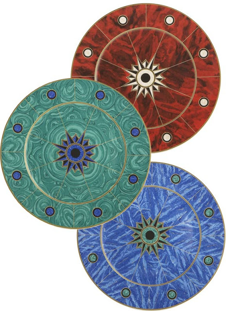 These 12 inch diameter plates are available in three colorways; Red Tortoise Shell, Green Malachite, and Blue Lapis. Matte gold trim outlines the plate and designs. Gold lines radiate from the center medallion and divide the body of the plate, as well as the soulder, into eigh sections.