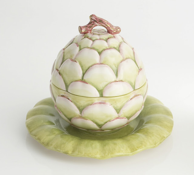 "Part of the 22k-gold-accented Tony Duquette collection by Mottahedeh, these porcelain chargers feature the legendary designer's signature malachite and lapis lazuli patterns. The serving plates (which start at $215 each) are complimented by a hand-painted artichoke - shaped tureen and stand ($440 for the set), based on an English antique. www.mottahedeh.com "