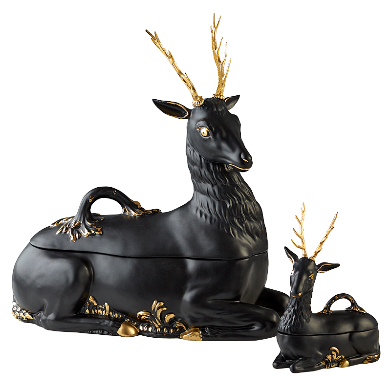 Our new stag is not exactly the same, but instead a wilder, tureen version. Unbound by chains and ready to leap off of your table, our Tony Duquette Stag Tureen by Mottahedeh can be seen two photographs up. (In both the larger tureen and small compote.) All accents are hand painted in 22k gold.