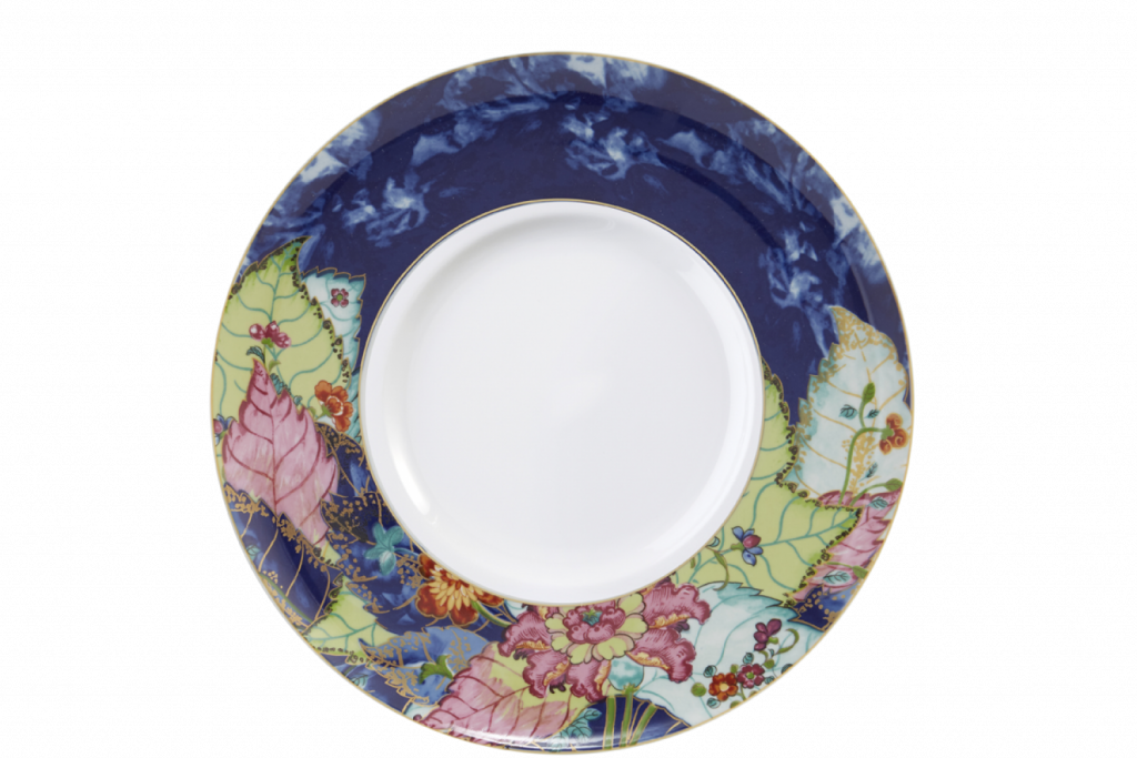 An exciting new addition to the Tobacco Leaf service. The bold colors of Tobacco Leaf are splashing on the wide border of the contempo service plate. This will add a bit of modern to the iconic classic pattern. Use it with solid plates to add a bit of whimsy or with Tobacco Leaf for a complete statement. It also makes a beautiful cake plate or serving dish! Made from high fired hard porcelain and edged in 22k gold, this plate is sure to bring fancy to your table.