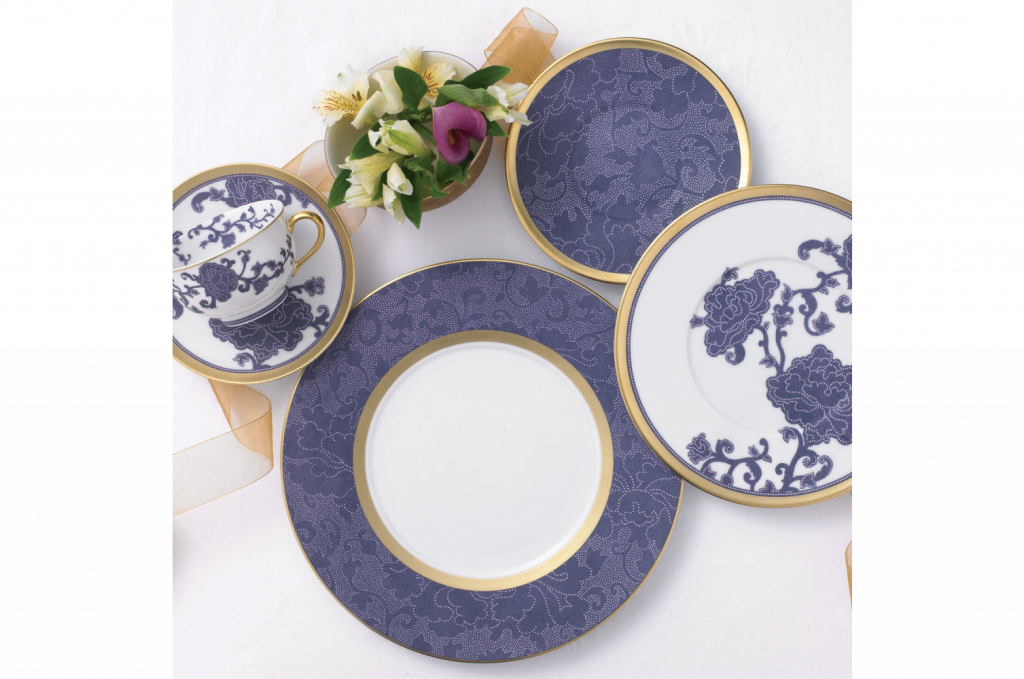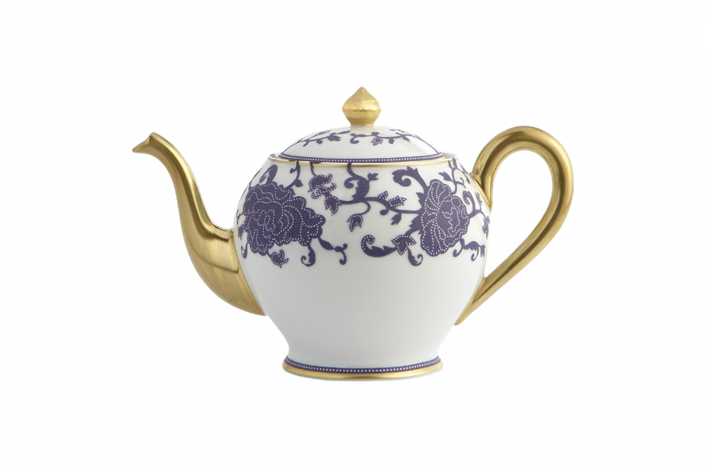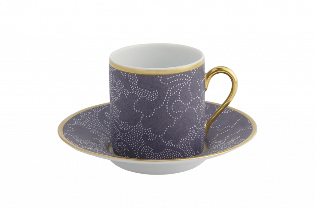 Like the story of 1,001 Nights, R. Haviland & C. Parlon's Sultane is a reflection of the splendors of the East. The amethyst stylized roses are reminiscent of a garden in the moon light. The design of the plates and cup were inspired by precious fabrics and lace. Pale lavender raised points enhance this effect and the matte 22k gold border imparts a traditional, yet avant garde, richness. Designed by Stephany Bellamy.
