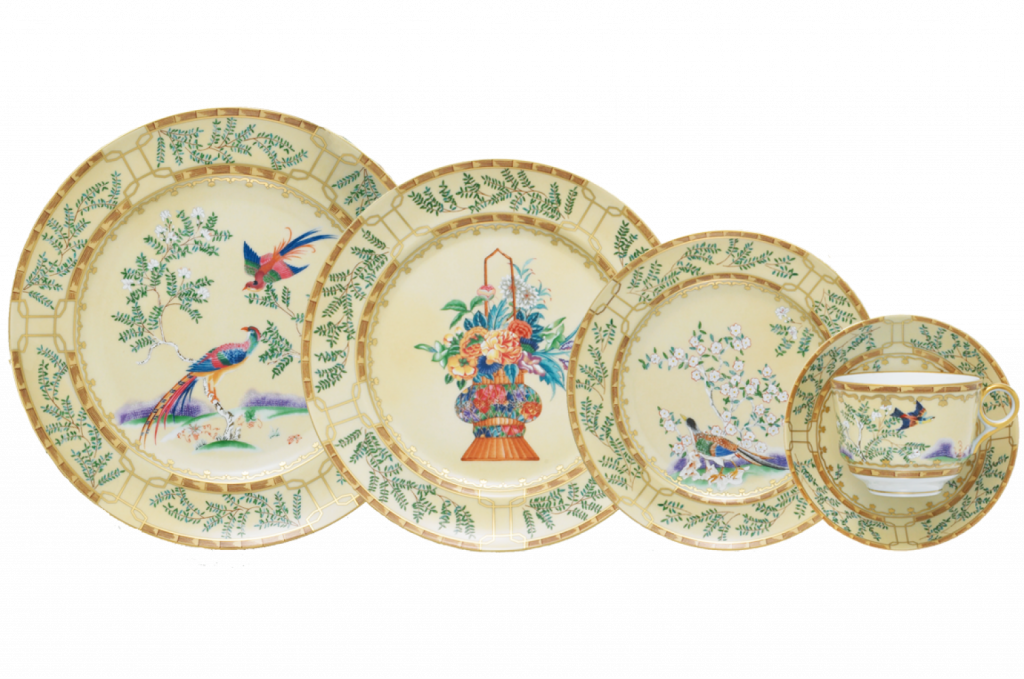 This exquisite design was inspired by hand painted 18th century Chinese wallpaper in the dining room of the Lightfoot House at Colonial Williamsburg. The decoration incorporates blossoming trees, hanging baskets of flowers and exotic birds. These were common features in Chinese inspired decorative arts, known as Chinoiserie, which were popular in Europe and colonies in the 18th Century.
