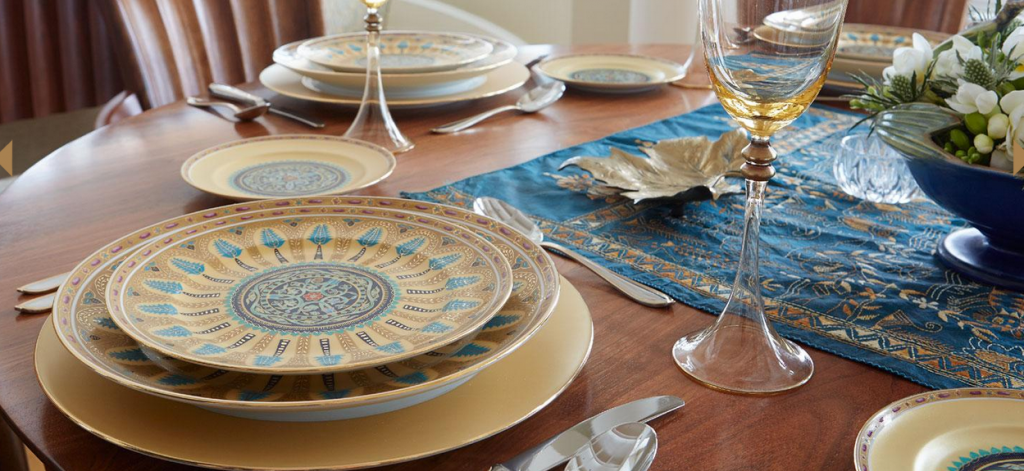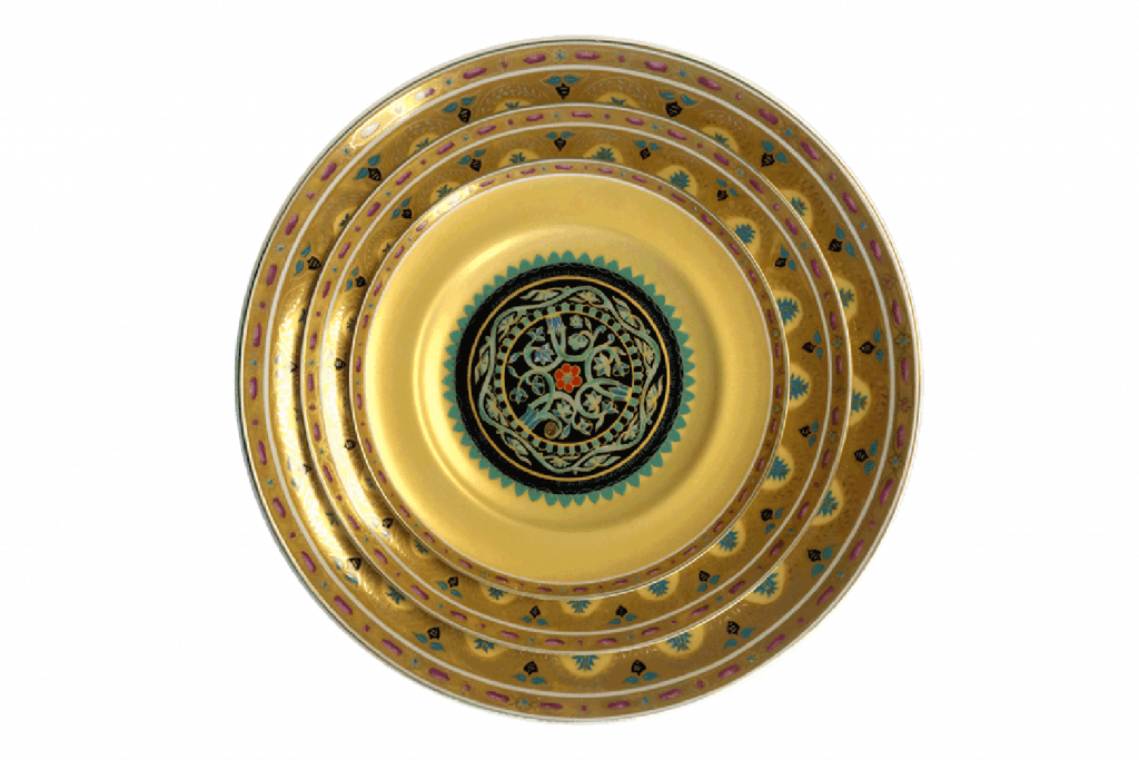 This lavish decoration incorporates the elements of a plate owned by Tsar Alexei Mikhailovich, dating to1667 and inspired by the domes of magnificent mosques in Istanbul, Turkey. The center of the plate is reminiscent of Celtic patterns. Truly universal in its theme, this historic design seems contemporary, the mark of excellent design.