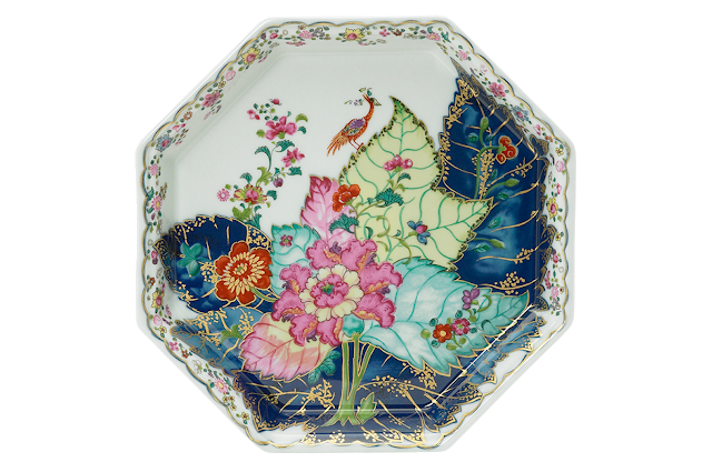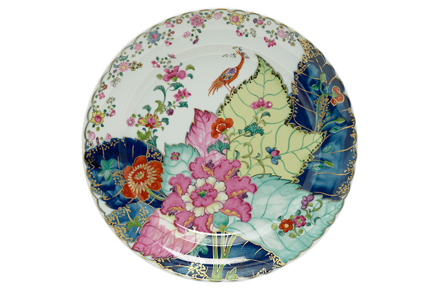 This extravagant design was originally made in China, probably for export to the Portuguese and Brazilian markets. Of all the 18th - century dinnerware patterns, this was the most highly prized. A small phoenix bird perches on the leaves of the flowering Nicotiana (Tobacco) plant. Twenty seven colors and 22k gold make up this pattern based on an original in the Metropolitan Museum of Art.