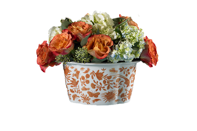 22k gold and rich oranges make this pattern perfect for the fall season. After Halloween use the cachepot for a floral arrangement on your Thanksgiving dinner table!
