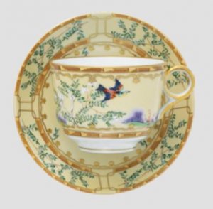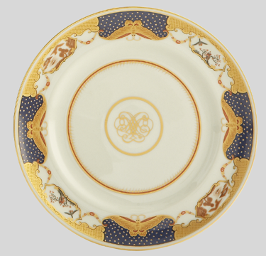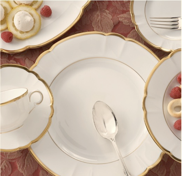 Our Haviland and Parlon, Colette Gold, is an all-over white dining service with a fine gold edging and line details seen on specific pieces, such as the teapot. Our second pattern, Golden Butterfly, is a precious blue/gold design on white featuring four gold butterflies with wings spread as wide as the plate’s ornate border. The border is comprised of other small details such as flowers and dainty detailing, while the plate’s center has a line-painted emblem resembling a butterfly.