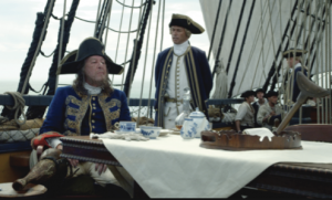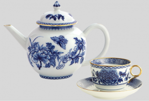 The scene shows Captain Barbossa on a ship, enjoying his breakfast of rum and granny smith apples. He pours rum into an Imperial Blue teacup, sitting at a table set with the matching saucer, creamer and teapot. The ornate, 18th century floral design is white porcelain painted with royal blue details, also from Colonial Williamsburg. What makes this pattern extra special for our ruggedly “regal”, Captain Barbossa, is it’s edged 22K gold and based on a design from the Ming Dynasty. Truly a treasure worth a pirate’s greedy desires.