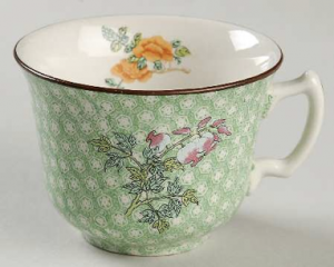 While he sits with the newly transformed vampire, Louis de Point du Lac, (Brad Pitt), you can see the discontinued pattern, Cornelia Green dinner plates set on the table before them. This pastel pattern features a pale green design with multi colored flowers and butterflies. This sweet, happy-looking design makes a contrasting statement to the dark ambiance and subject matter of the film. It also reinforces the formal setting and time period, as Louis’ southern plantation is an embodiment of late 1700s wealth.