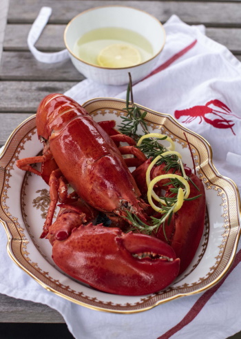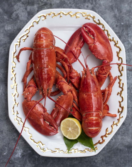 Steamed lobster served with herbs and lemon water in the Carp platter a Mottahedeh reproduction from the Dallas Museum of Art.