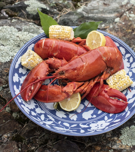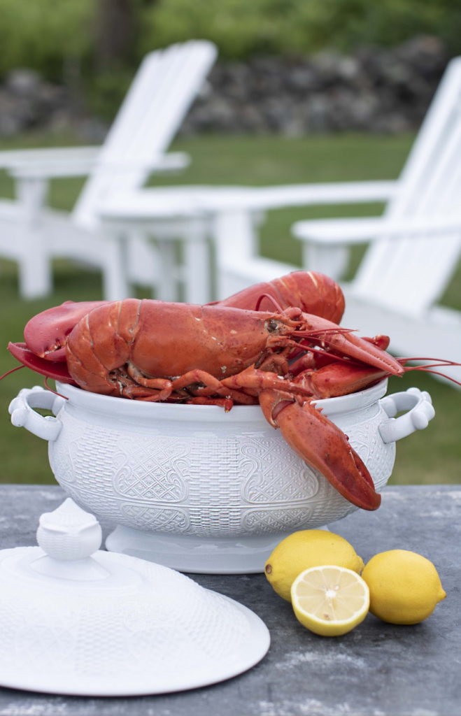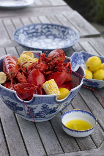 A feast of lobsters served with corn, drawn butter and lemons in Mottahedeh’s Blue and White Monteith Bowl.