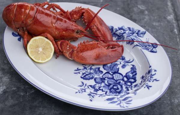 This steamed lobster is shown on Mottahedeh’s Emmaline blue and white floral pattern platter.